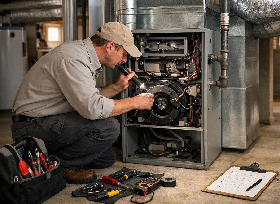 HVAC technician performing furnace maintenance inspection in basement utility room